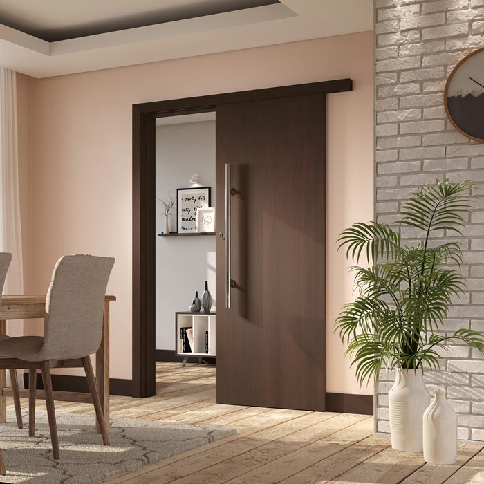 Solução prática para ambientes com pouco espaço para giro. Desliza suavemente sob trilhos garantindo leveza e funcionalidade.